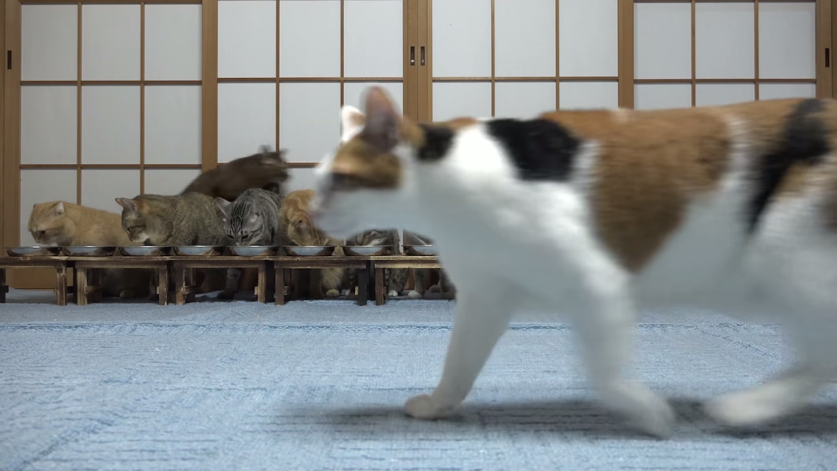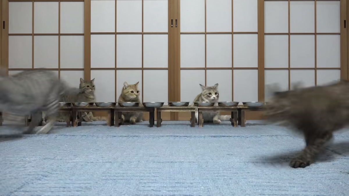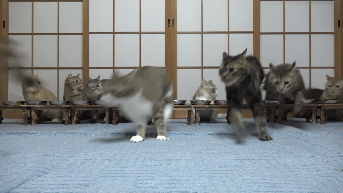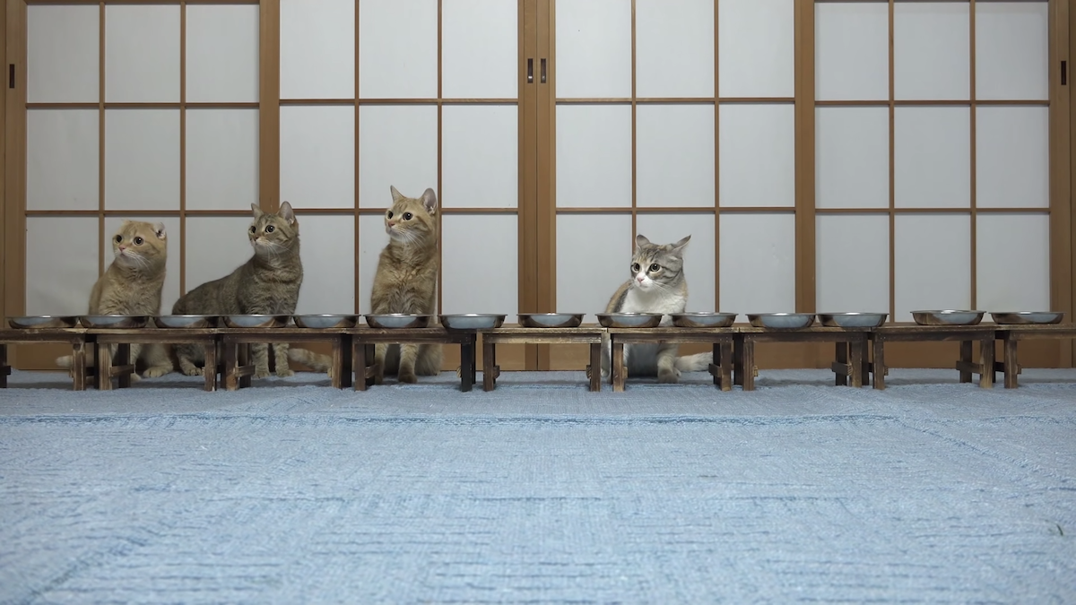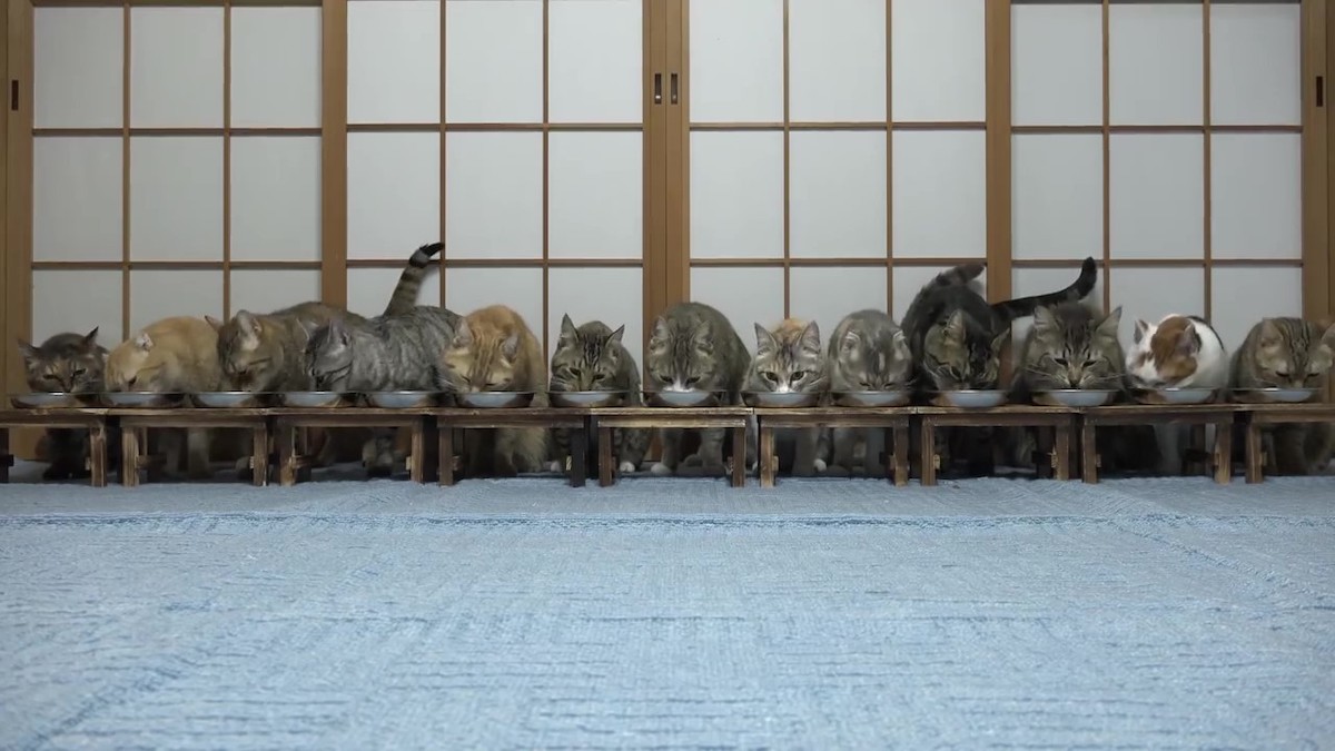 ▼終於乖乖一字排開吃飯飯啦~看到貓咪吃著碗裡的飯,感覺好療癒啊。不知道大家有沒有發現,雖然有14個盤子,但其實只有13隻貓咪在吃呢。
