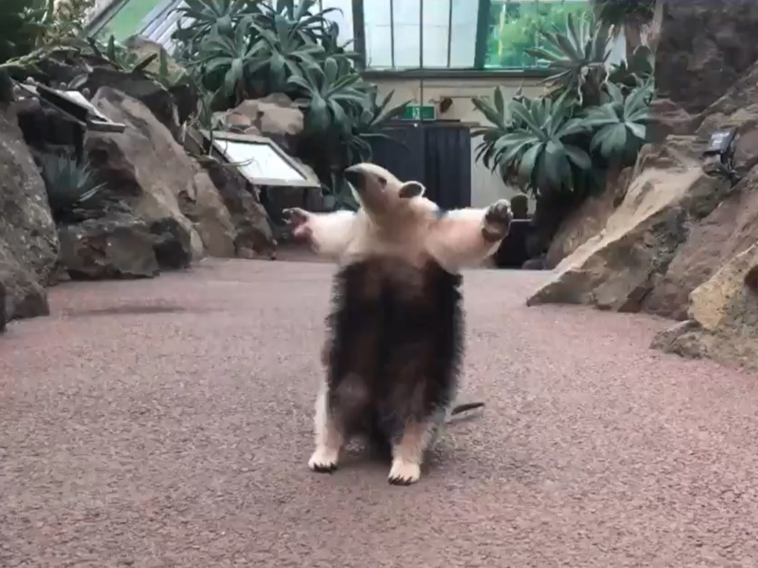 ▼小食蟻獸用後腿站立,展開雙臂,看起來酷酷的。這個動作是食蟻獸威嚇的pose,不知道牠是不是想嚇到飼育員,讓飼育員給牠更多零食呢?