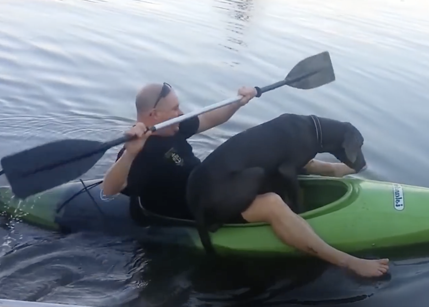 2021年08月05日狗狗一分一秒都不願意跟主人分開!國外一位飼主迷上戶外活動,準備去劃皮艇。他養的大丹犬雖然怕水,但不願意跟他分開,堅持跟在他身邊,努力想把自己塞到座艙裡去。狗狗那忐忑不安,卻又勇氣滿滿的模樣看起來超可愛。