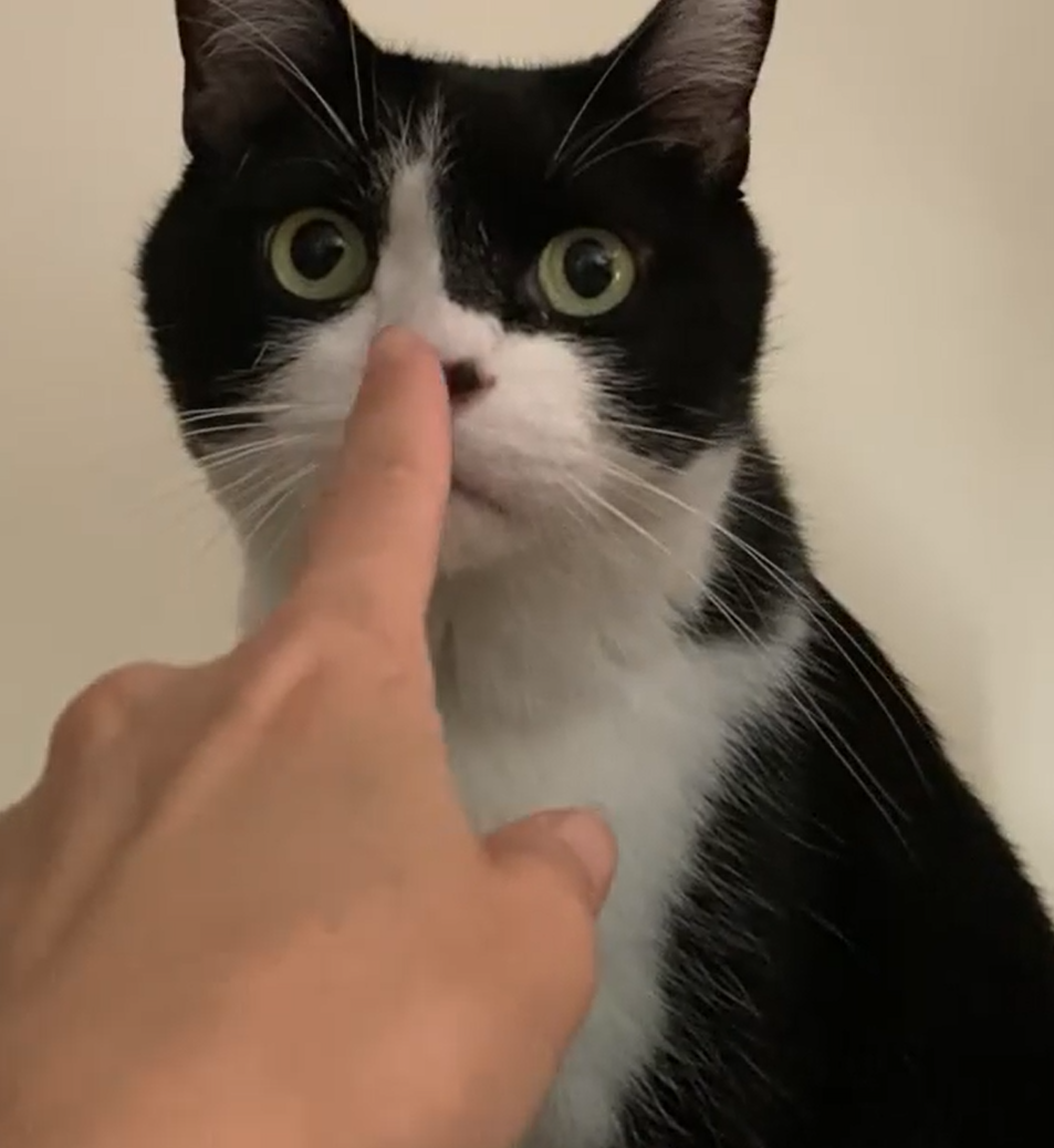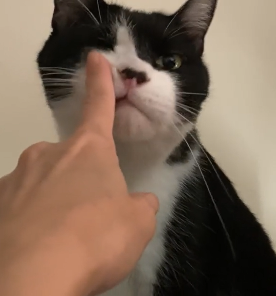 ▼從影片中可以看到,奴才向貓咪伸出手指,直指貓咪的鼻頭。這個動作不管對於人類還是動物來說都不算禮貌。很多貓咪這時候會咬上去或抓上去,狠狠教訓不尊重自己的人類。但下面這隻貓咪卻不一樣,牠竟然主動去蹭手指撒嬌。