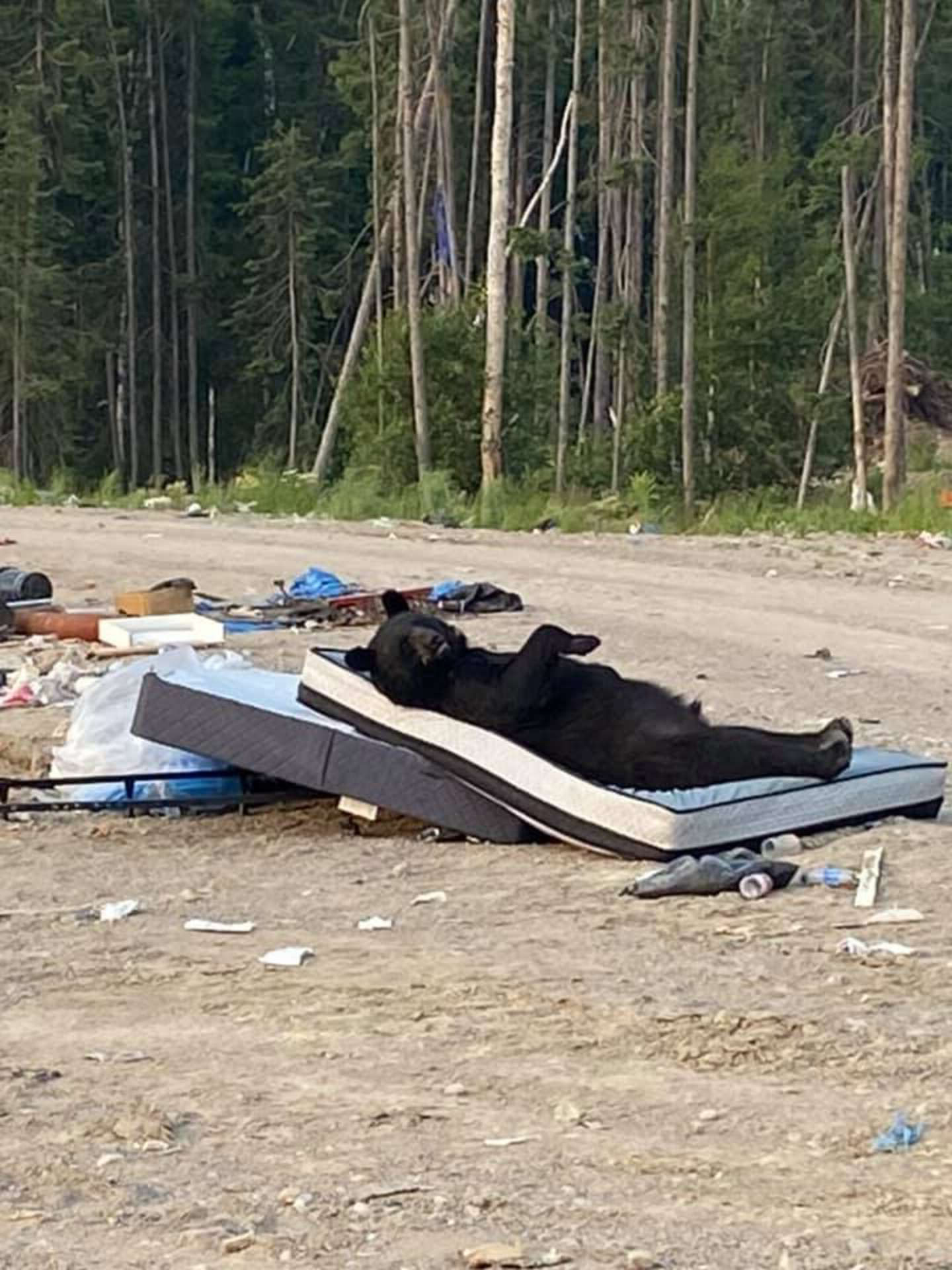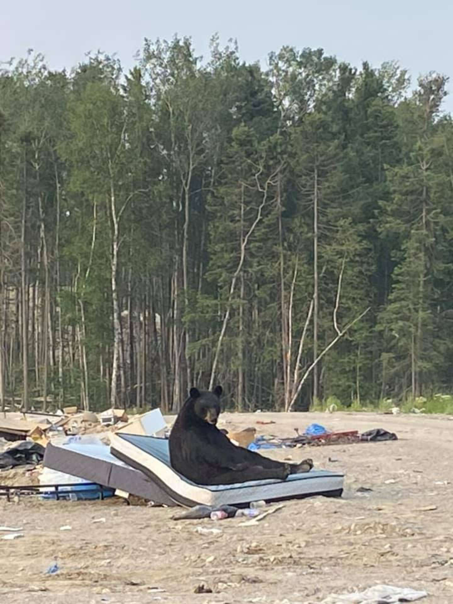 2021年08月06日野生動物也懂得享受生活!最近加拿大安大略省一名網友Keira Mamakwa去垃圾掩埋場倒垃圾時,看到了有趣的一幕。只見垃圾場中有一張廢置的床墊,一隻黑熊正懶洋洋躺在上面。牠看到有人出現,並沒有驚慌逃跑,而是好奇地歪頭看過去。Keira忍俊不禁,連忙拿出手機拍了下來。