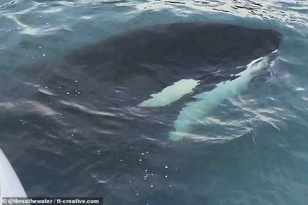 ▼海獺為躲避虎鯨跳上觀光船: