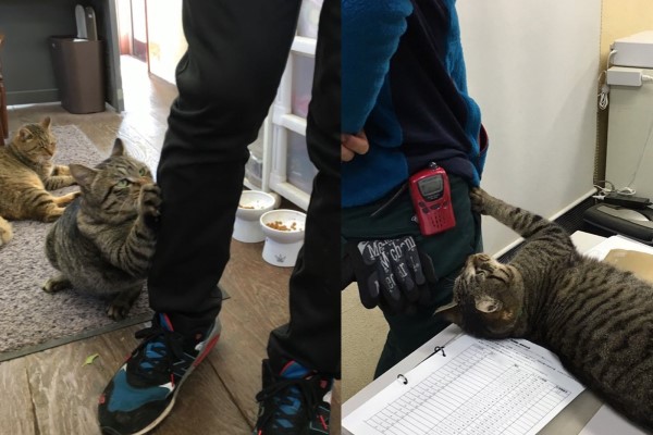 ▼牠們會睡在辦公室門口阻擋同事們進出,還會懶洋洋躺在辦公桌上。不僅如此,同事工作時牠們會跳入懷中、跳上辦公桌求抱抱、求摸摸,甚至將爪爪搭在同事頭上,似乎在說:「把零食全都交出來!」