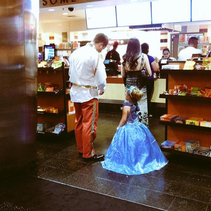 ▼爸爸帶著完整裝扮的女兒一起來看《灰姑娘》電影。