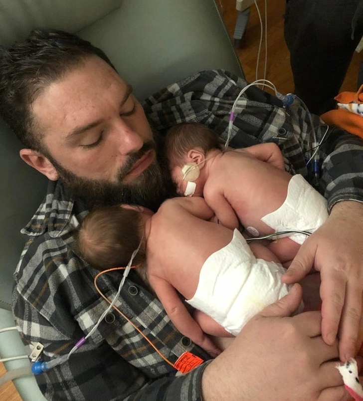 ▼這對雙胞胎在第30週就出生了,新手爸爸正小心的呵護她們。
