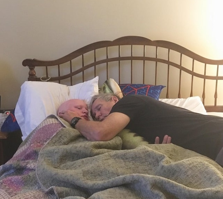 ▼為了照顧不舒服的兒子,爸爸累得昏睡在床上。