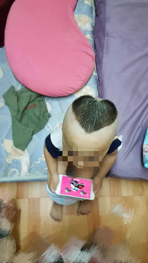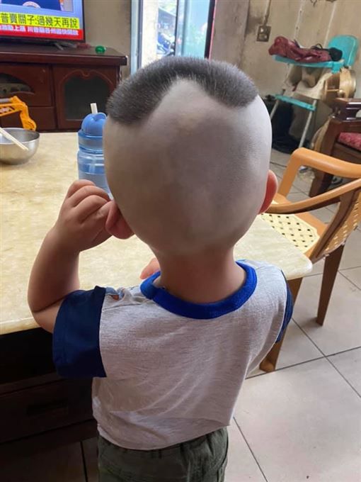 ▼原po表示:「我就知道小孩跟爸爸洗澡洗那麼久肯定沒好事!」從照片中可以看到,小孩的頭髮被剪成了整齊的心型,這顆心非常工整,旁邊的頭髮被全部剃光,看起來怪怪的。