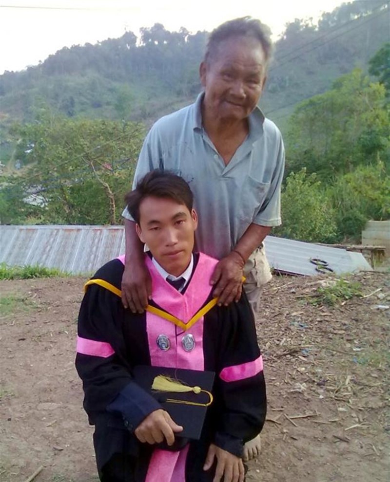 ▼這位泰國網友名叫披索,母親因為生他難產離去人世,靠著父親做農活從小養大。披索的家境困頓,他父親一生沒讀過什麼書,但為了讓披索能出人頭地,特別送他到外地讀書,並一肩挑起所有家計。當披索從泰國清萊皇家大學畢業後,就特別回家鄉穿畢業照和老父拍照。