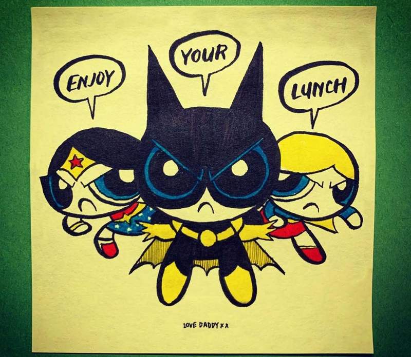 ▼女兒第一天上學比較緊張,Rob Biddulph就在她的便當上貼了一張便利貼,為她加油。之後「便當上的便利貼」成為了父女之間的小傳統,每天女兒都能在便當上看到爸爸的新作品。