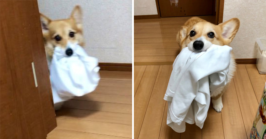 媽說要洗衣服!小柯基馬上化身「行動洗衣籃」 小短腿急跑來:偶來幫忙~