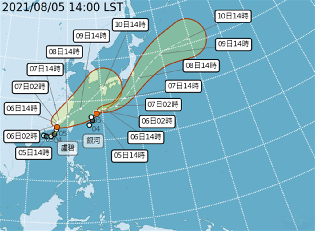 2021年08月06日第9號颱風盧碧今天(6日)已經減弱為熱帶性低氣壓,預估明、後兩天最接近台灣,易有短延時強降雨,西半部地區有陣雨或雷雨,中南部地區並有局部大雨或豪雨發生的機率,其他地區也有局部短暫陣雨或雷雨。現在第10號銀河颱風、第11號輕度颱風妮妲也生成。氣象局表示,將出現罕見的盧碧、銀河、妮妲三颱共舞的狀況。