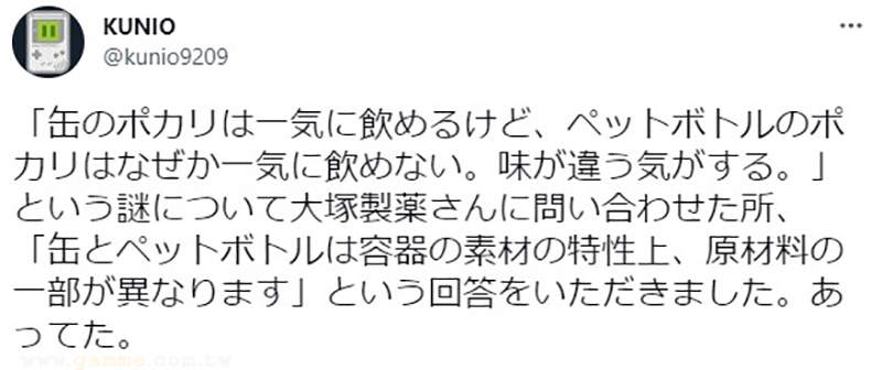 2021年08月09日一直有傳聞稱,同一品牌的飲料,不同包裝的成分不一樣,所以味道也不同。最近一名日本網友就表示,他覺得「寶礦力水得」罐裝比瓶裝要好喝一些,這讓他非常疑惑,兩者的差別是什麼?他特別去詢問廠商,這才得知罐裝與瓶裝加入的材料真的有些許不同。