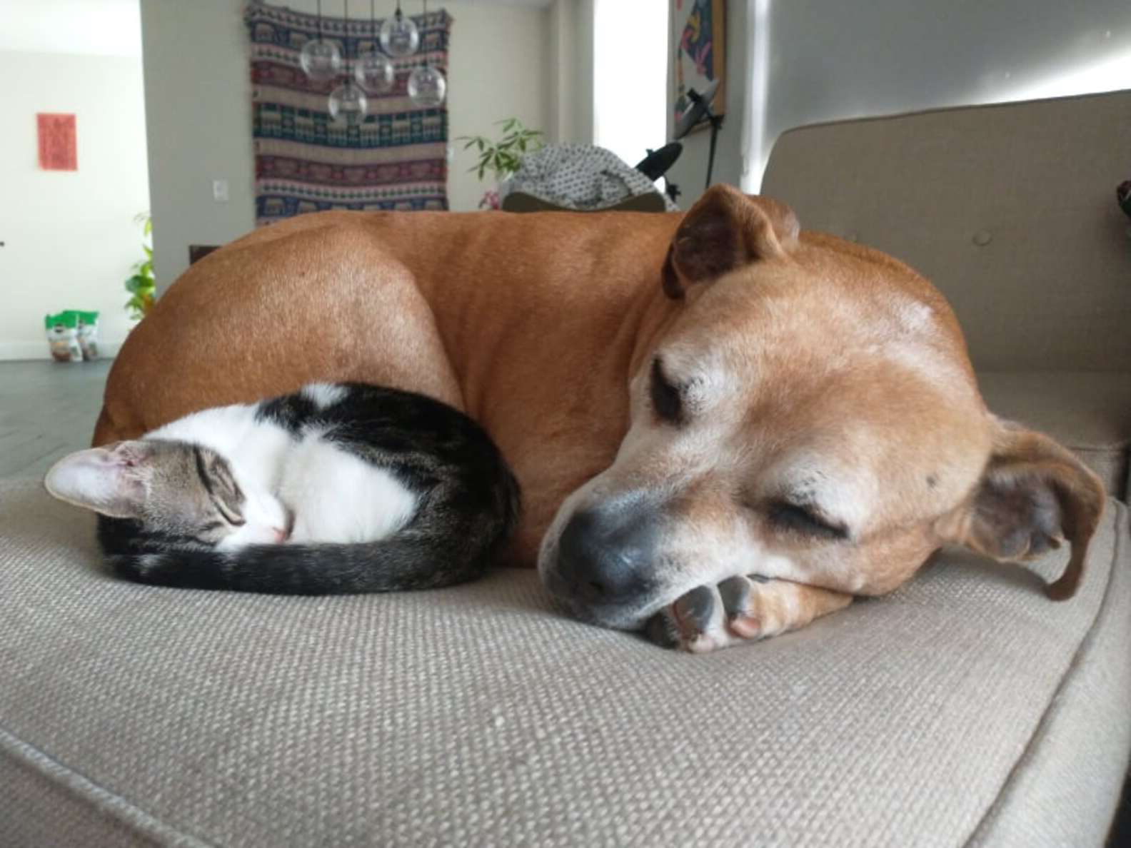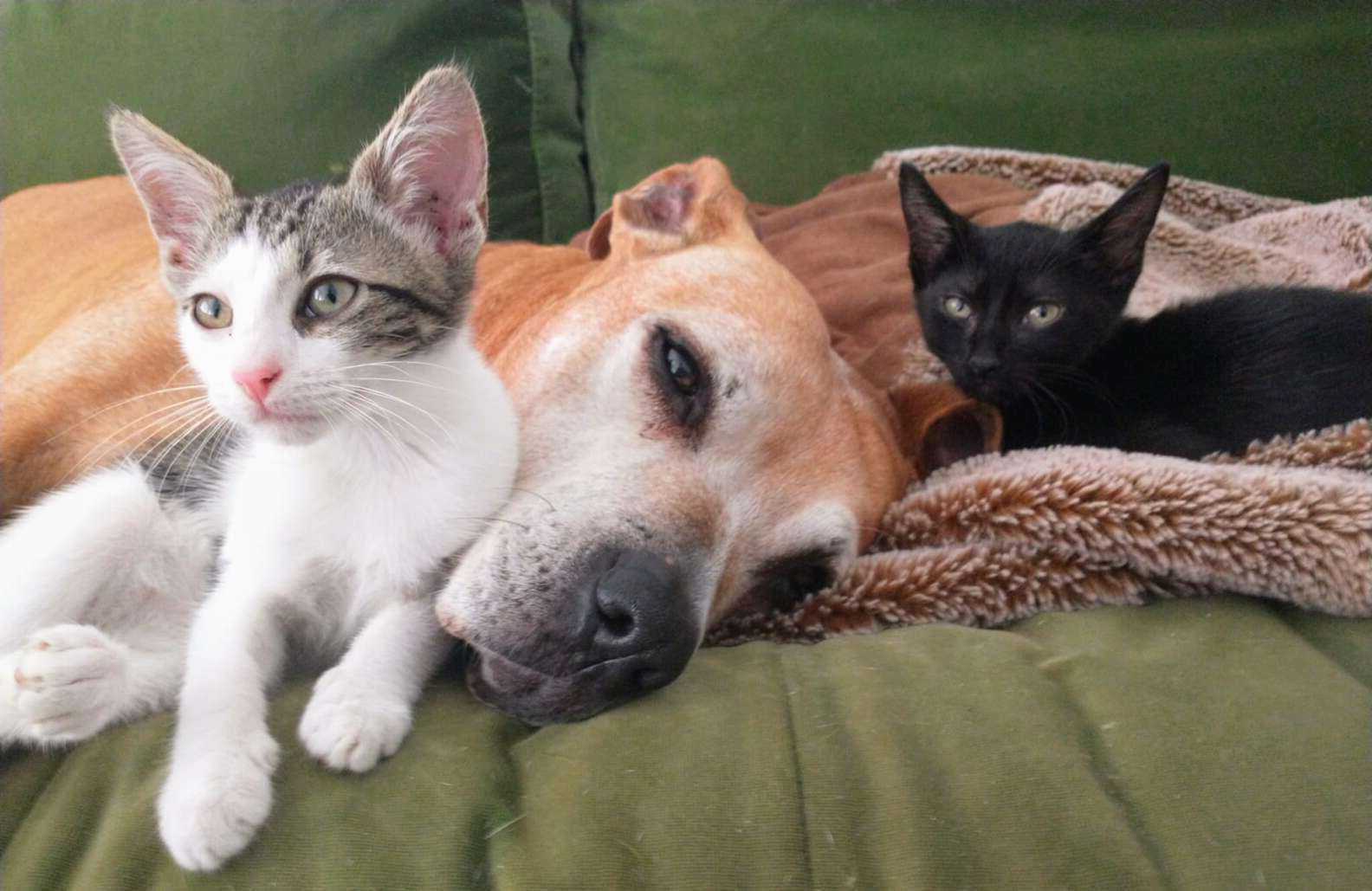 ▼Sheitan出生之後就被綁在戶外,風吹雨淋12年。Bridget領養牠後,牠才體驗到成為室內犬的生活。Bridget表示,Sheitan是一隻很豁達的狗狗,只對食物和其他小動物感興趣。牠喜歡幫忙照顧中途小貓,對年幼的動物格外友善。牠會蜷縮在小動物身邊,就像牠們的媽媽一樣。