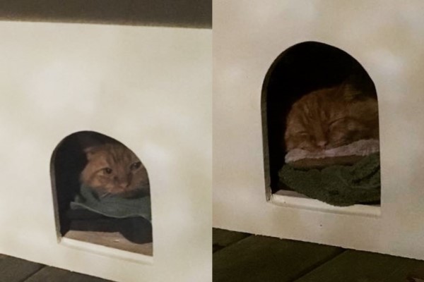 ▼天氣逐漸變涼,Lex擔心Cinnabon受凍,就在家門口安置了一個小木屋,還在裡面舖上溫暖的毛毯。Cinnabon透過窗戶看了Lex一眼,果然鑽進去呼呼大睡。這讓Lex非常欣慰,他覺得貓咪終於開始信任自己了!