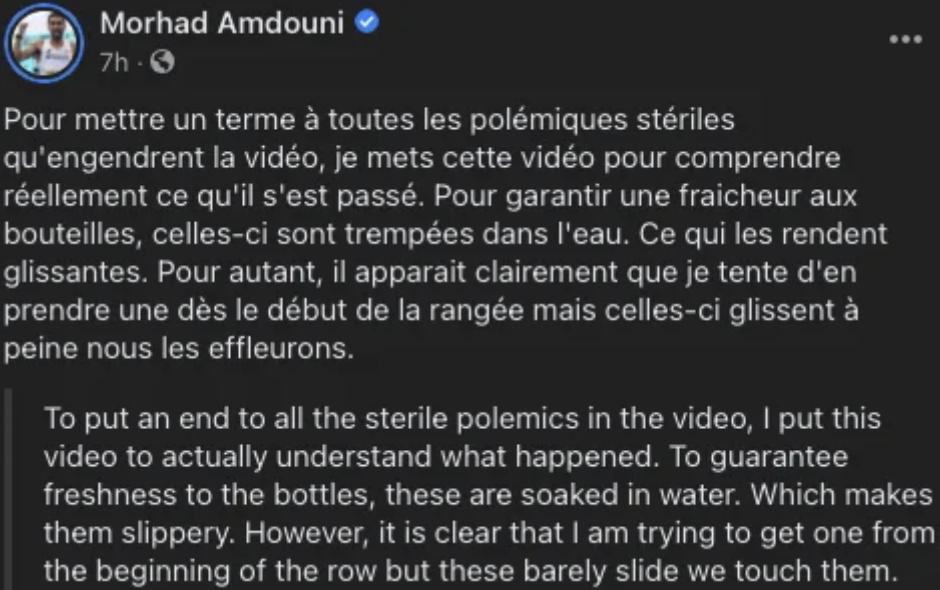 2021年08月11日東京奧運已經閉幕,男子馬拉松是田徑最後1項比賽,肯亞選手普喬蓋(Eliud Kipchoge)不負眾望,拿下金牌。馬拉松決賽中,法國跑者阿姆杜尼(Morhad Amdouni)的荒唐表現引發討論。他經過補給站的時候,竟然伸手把桌子上排列的礦泉水全部掃落。他自己拿走最後一瓶,後面的選手都沒有喝到。