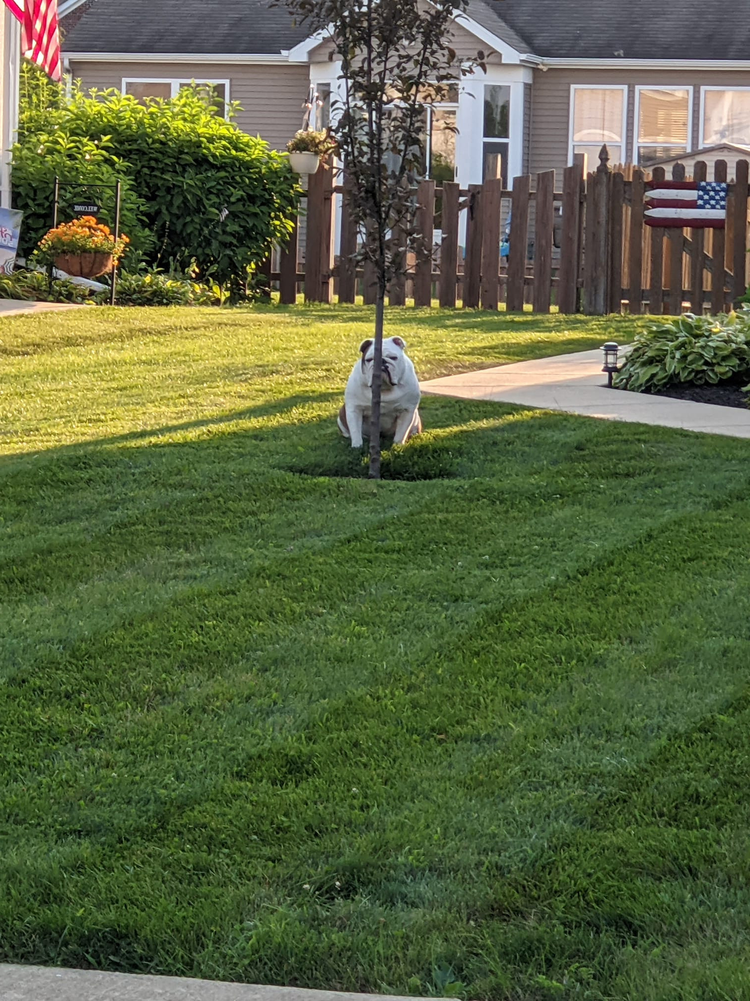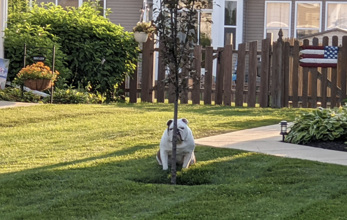 2021年08月13日這隻狗狗很會躲貓貓~國外網友Jake Meyer家中有一隻可愛的英國鬥牛犬Buehrle。Buehrle雖然外表強壯,內心卻住著一個純真的小朋友。牠調皮愛玩,那天和把拔玩躲貓貓遊戲,竟跑到庭院裡一棵小樹後躲起來。把拔看到牠癟嘴蹲坐在樹後的模樣,忍不住笑出聲。