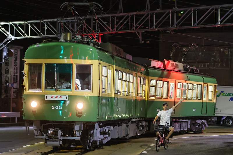 江之島電鐵從1960年代使用至今的一款列車「江之島電鐵300形305編成」,是非常受歡迎的經典車輛。前段時間這一車輛重新塗裝、整修,在8月5日晚進行測試行駛。鐵道迷們得知這一消息後,準備去拍攝這一景象留作紀念。