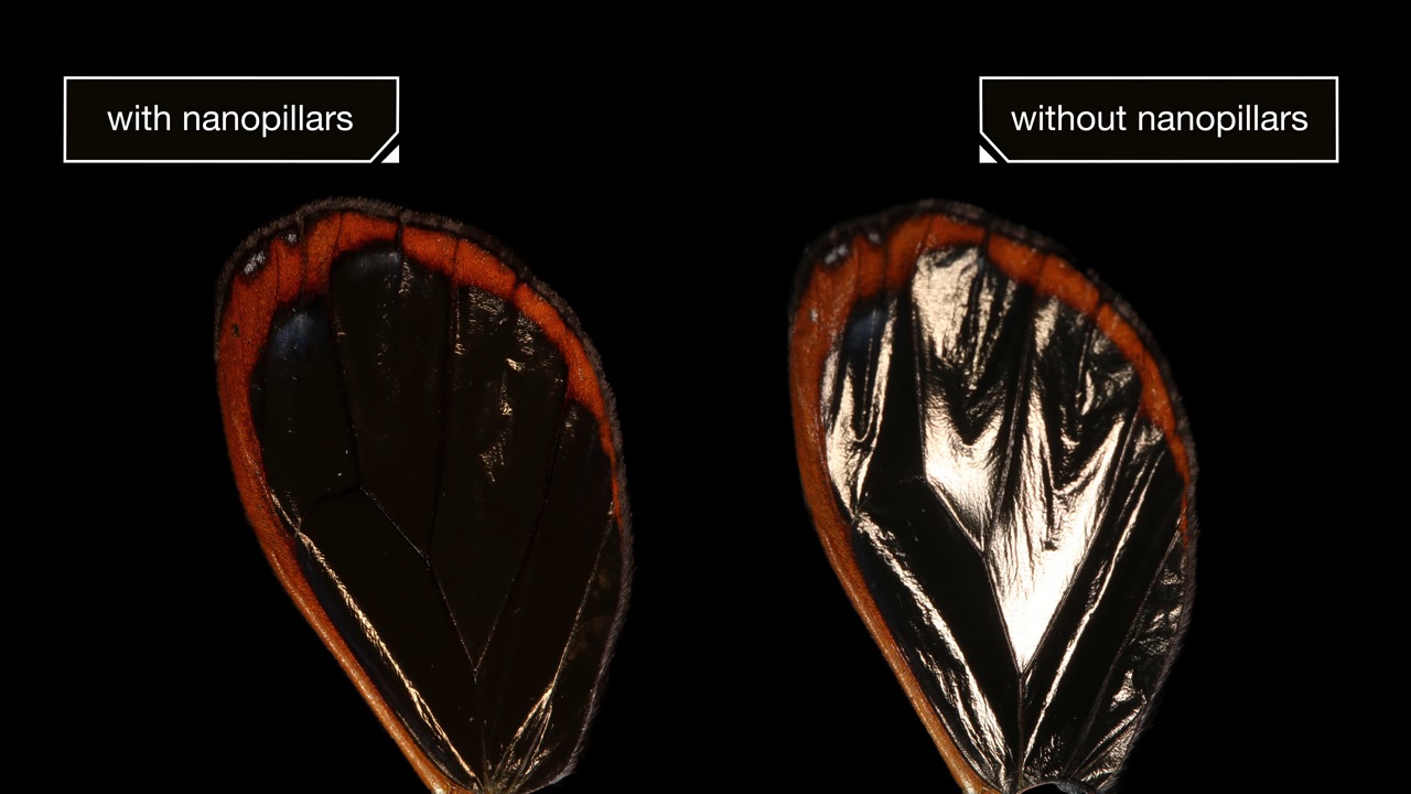 ▼科學家們嘗試用化學藥劑去除這些翅膀表面的奈米柱,結果發現沒有了奈米柱的翅膀反光程度真的差很多。