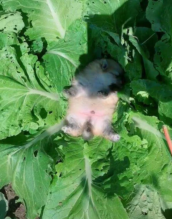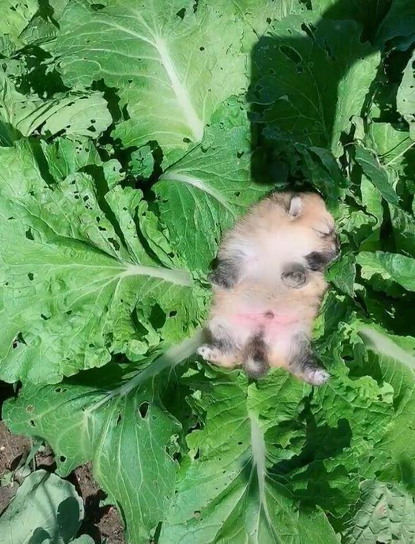 小奶狗睡得非常香甜,主人走到牠的身邊,牠都沒有發現。看來早晨的陽光非常舒適,很適合曬日光浴。小奶狗舒服躺在菜葉上,周圍也是綠油油一片,心情放鬆、感覺舒暢,自然很快睡著了。