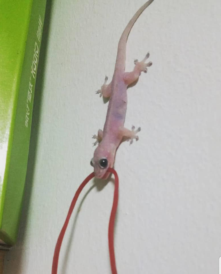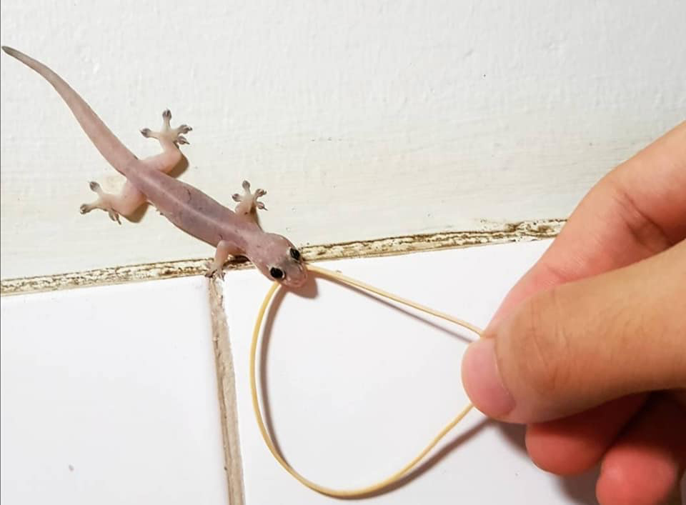 ▼這隻小壁虎有一個非常奇怪的小習慣,那就是用嘴巴叼皮筋。欣汉認為牠可能是肚子餓了,或者把皮筋當成了玩具。