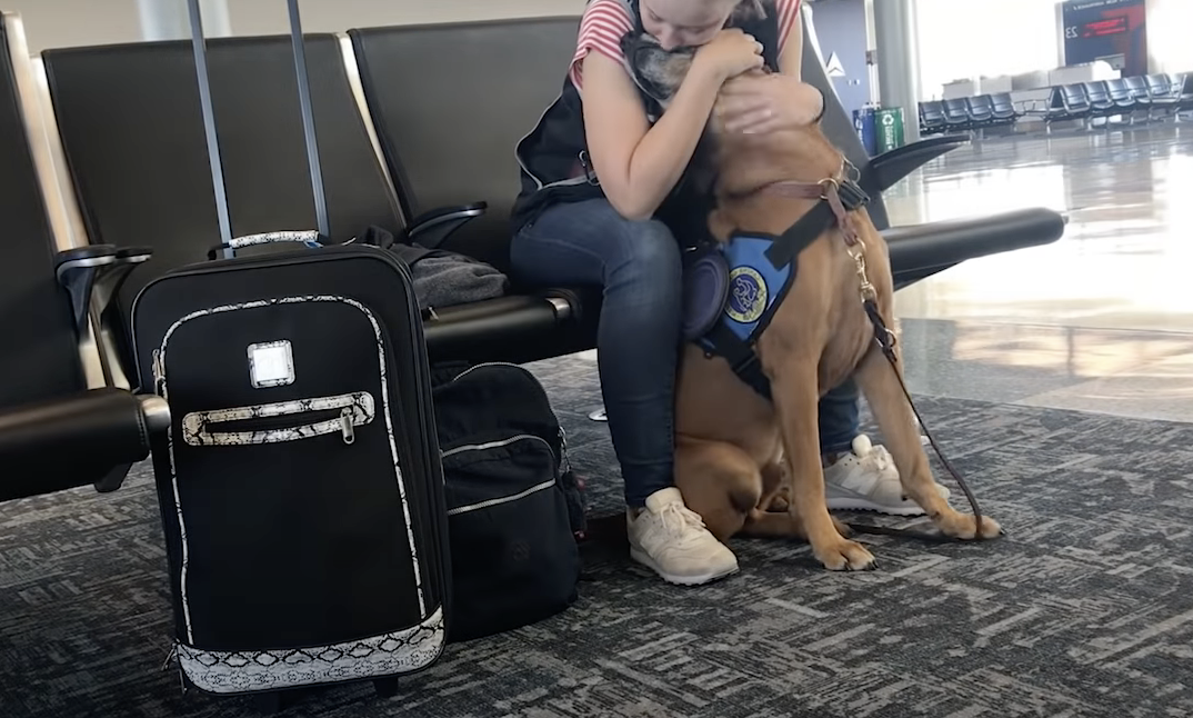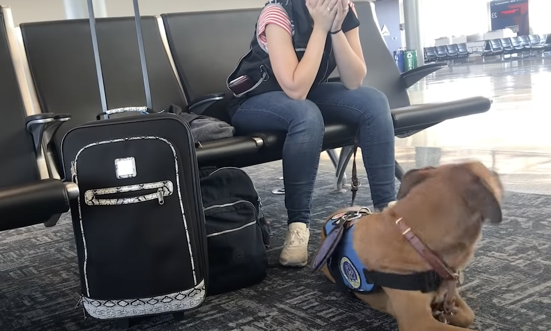 ▼在Amber的訓練下,Oakley學會了觀察她的體溫、呼吸和心跳變化。每當Amber需要幫助,Oakley就會第一時間提供協助。那天Amber帶著狗狗來到機場大廳,她的恐慌突然發作,忍不住用手摀住臉,看起來沮喪又懊惱。