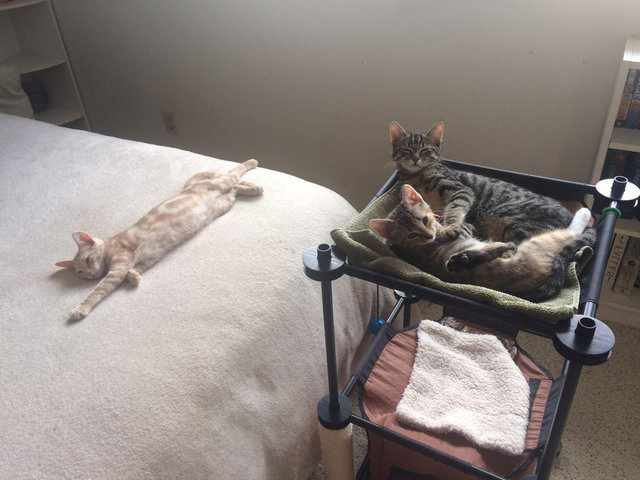 ▼家中多了3隻小貓,爸媽就把喬瑟夫的房間當成了貓咪房。平時這些精力旺盛的小貓咪會到處玩鬧、冒險、探索,累了就回房間去休息。喬瑟夫看到自己的房間變成貓咪房,3隻小貓還睡得超舒服,當下覺得好氣又好笑,不是說要改成健身房嗎?!