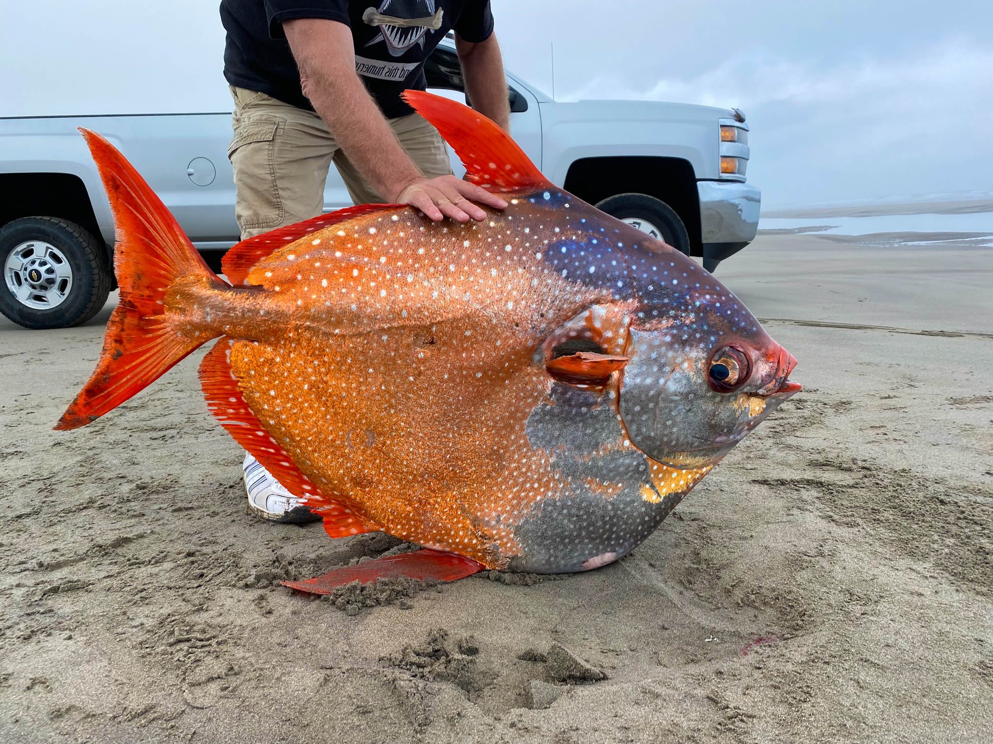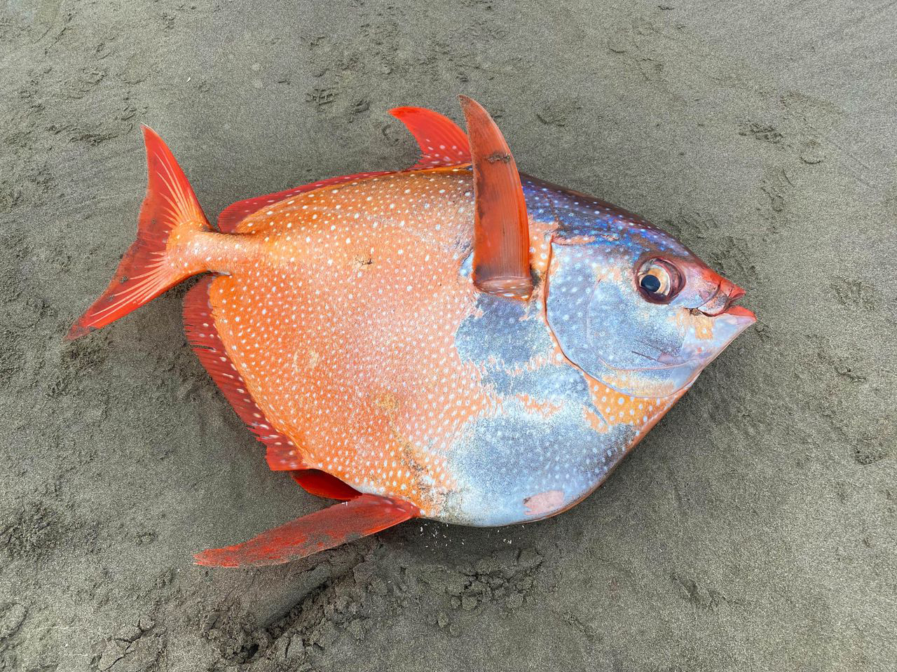 ▼不久前,俄勒岡州海濱水族館(Seaside Aquarium)的一位志工在日落海灘發現了一尾色彩鮮艷的「怪魚」。牠體長約106公分、重約45公斤。專家表示,這是月魚(opah),也被稱為月亮魚(moonfish),是世界上已知魚類中唯一的一種溫血魚。