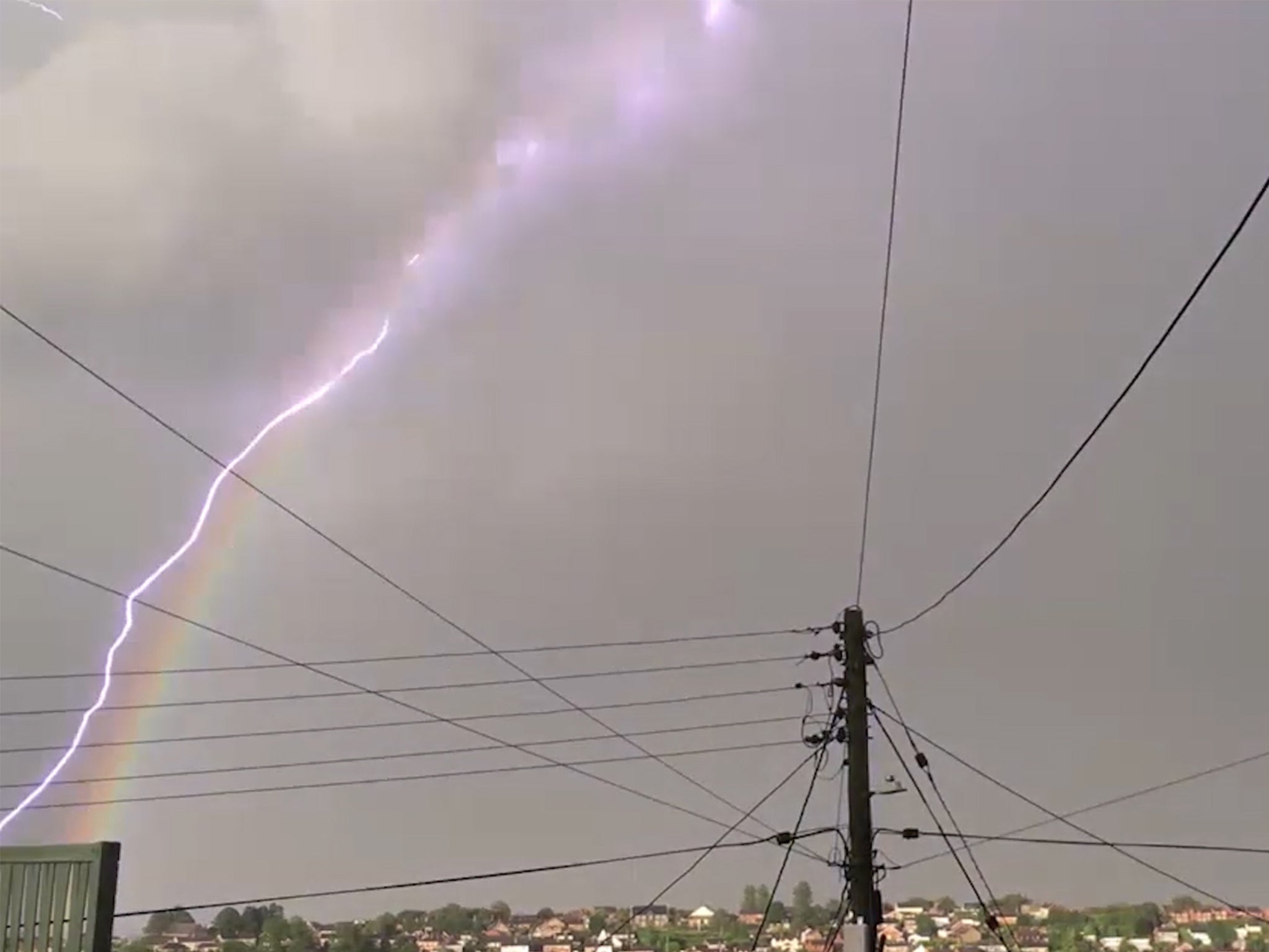 ▼Steven表示,風雨來臨時他正在花園中上私人教練課,期間他聽到了奇怪的嗡鳴聲。下課後他拿起手機,準備拍照看看,沒想到隨手拍到了閃電穿過天空,沿著彩虹劈下的畫面。他也驚訝地寫下「這簡直是百萬分之一的機率,我一直都希望能拍下這種罕見的異象,這次真的被我捕捉到了」。