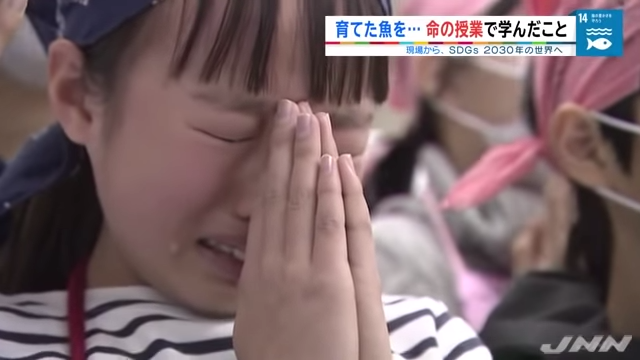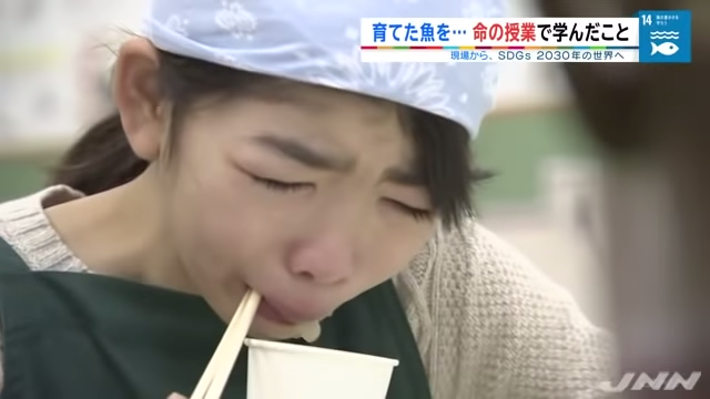 ▼有些孩子們受不了,紛紛閉上眼睛、摀住耳朵。最誇張的是,就連表決時表達不想吃的學生,也要把魚吃下肚。這些7歲的孩子一邊啜泣一邊把魚肉塞進嘴巴裡,很多孩子對寵物魚說「對不起」,看起來很無助,模樣讓人不捨。