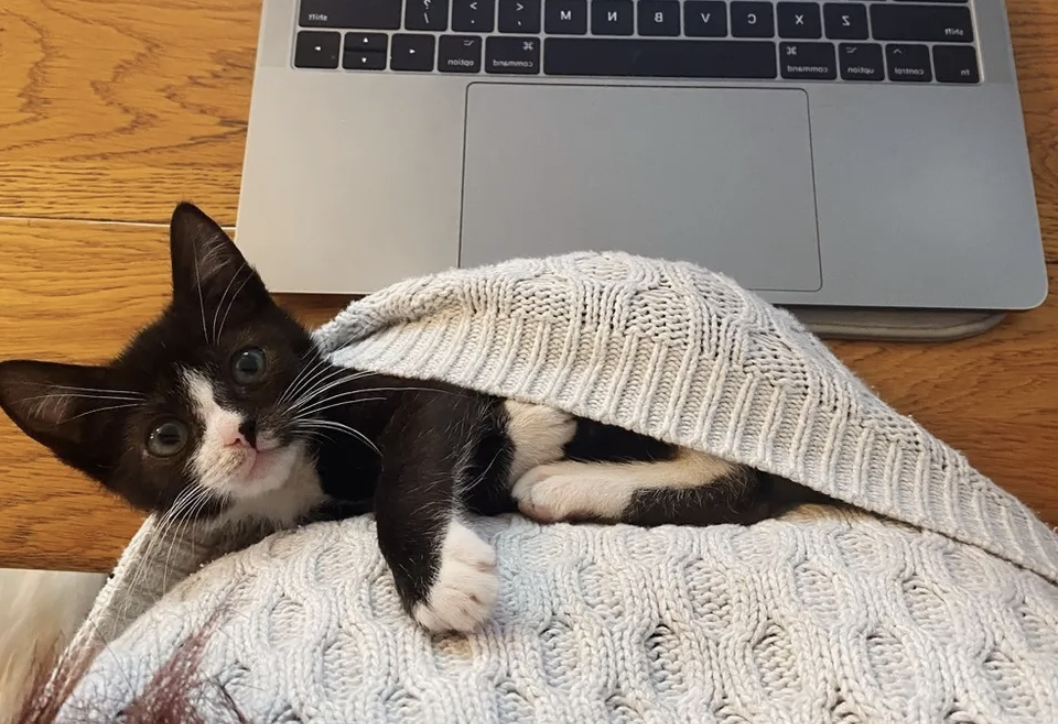 ▼Ceb的外表有了很大的變化,但牠性格沒有變。牠依舊非常親人,每次中途媽媽打開筆電工作,牠都會跑過來窩在她的懷裡撒嬌。Dannielle特別在書桌邊為牠準備了一張小床,但牠還是喜歡窩在中途媽媽懷裡。