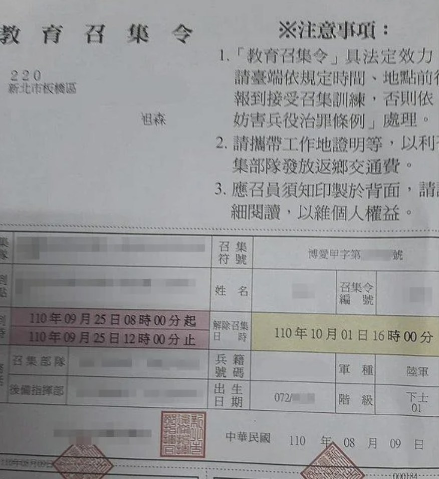 ▼他曬出國軍教召令,表示退伍10年從未被教召過,「這次竟然中了,而且是7天,38歲進去教召要幹嘛啦?都已經當一寶爸、工作那麼久了。不過從來沒被召過,有點期待就是啦!我應該不會成為那梯教召最老的吧,七年級頭段班應該不多人收到?」