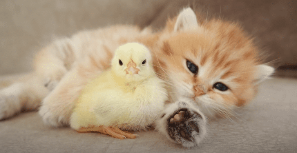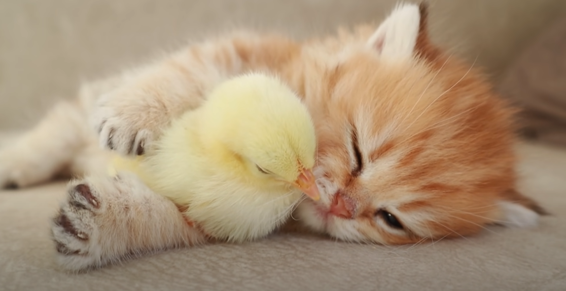 可愛的總和!小奶喵被介紹「朋友小雞」 2個隻秒混熟:抱一起睡搞搞❤️