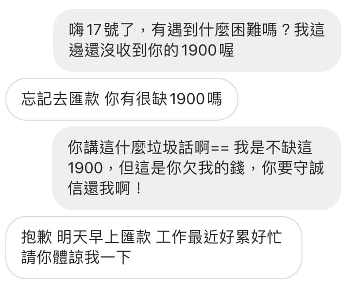 ▼原PO在臉書社團中表示,「遇到這種欠錢的人,你們會怎麼回覆他?」表示自己借1900元給一位朋友快2年了,而且那位朋友言而無信已經第3次,雖然1900元只是小錢,但是讓人感覺很不好,只見對方還回覆說:「工作最近好累好忙,請你體諒我一下」。之後原PO再度向對方催還款,而那位借錢朋友這次卻表示「自己現在手頭緊」,希望月底再還款。