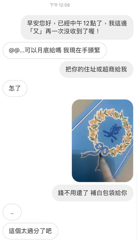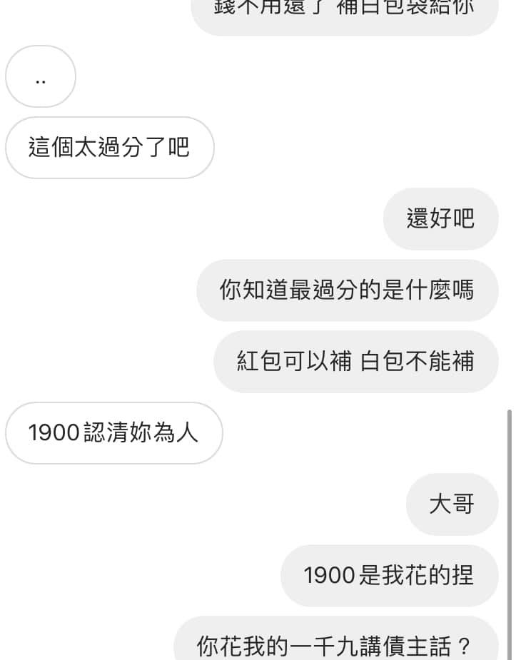 ▼這次原PO直接出招,向對方要住址或收貨超商,對方疑惑回「怎了」,原PO直接不客氣PO了一張白包照並表示:「錢不用還了,補白包袋給你」並補上一句「紅包可以補,白包不能補」,讓對方直呼:「1900認清妳為人!」讓原PO傻眼回:「你花我的1900講債主話?」之後對方竟還向兩人共同朋友抱怨,讓原PO嘆對方欠1900元2年還敢討拍!