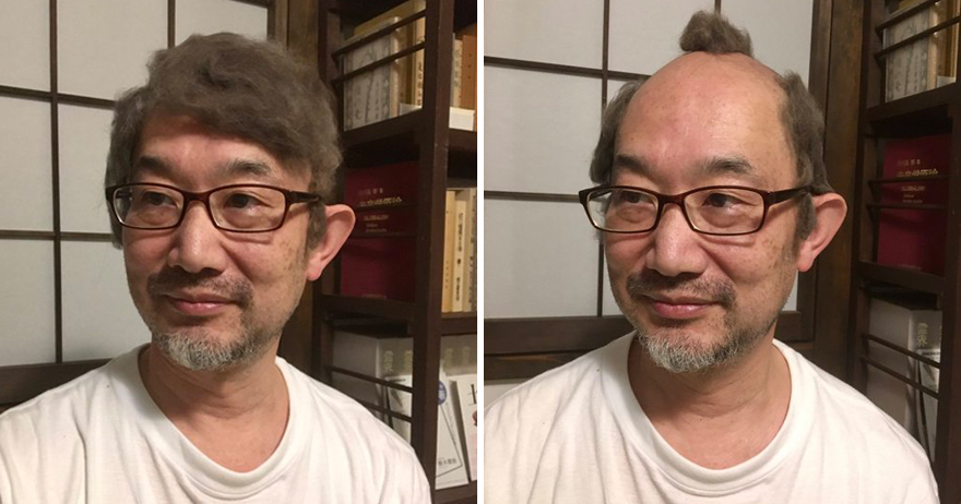▼山口先生住在海拔1200公尺的富士山北側,家中養了5隻貓咪。他說:「每到換季的時候,牠們真的掉很多毛,所以我就在想,能不能把這些毛拿來做點什麼。因為我的頭髮實在不多,所以就把貓毛放到了頭上,經過老婆的巧手改造後就變成了圖片上的那樣。」