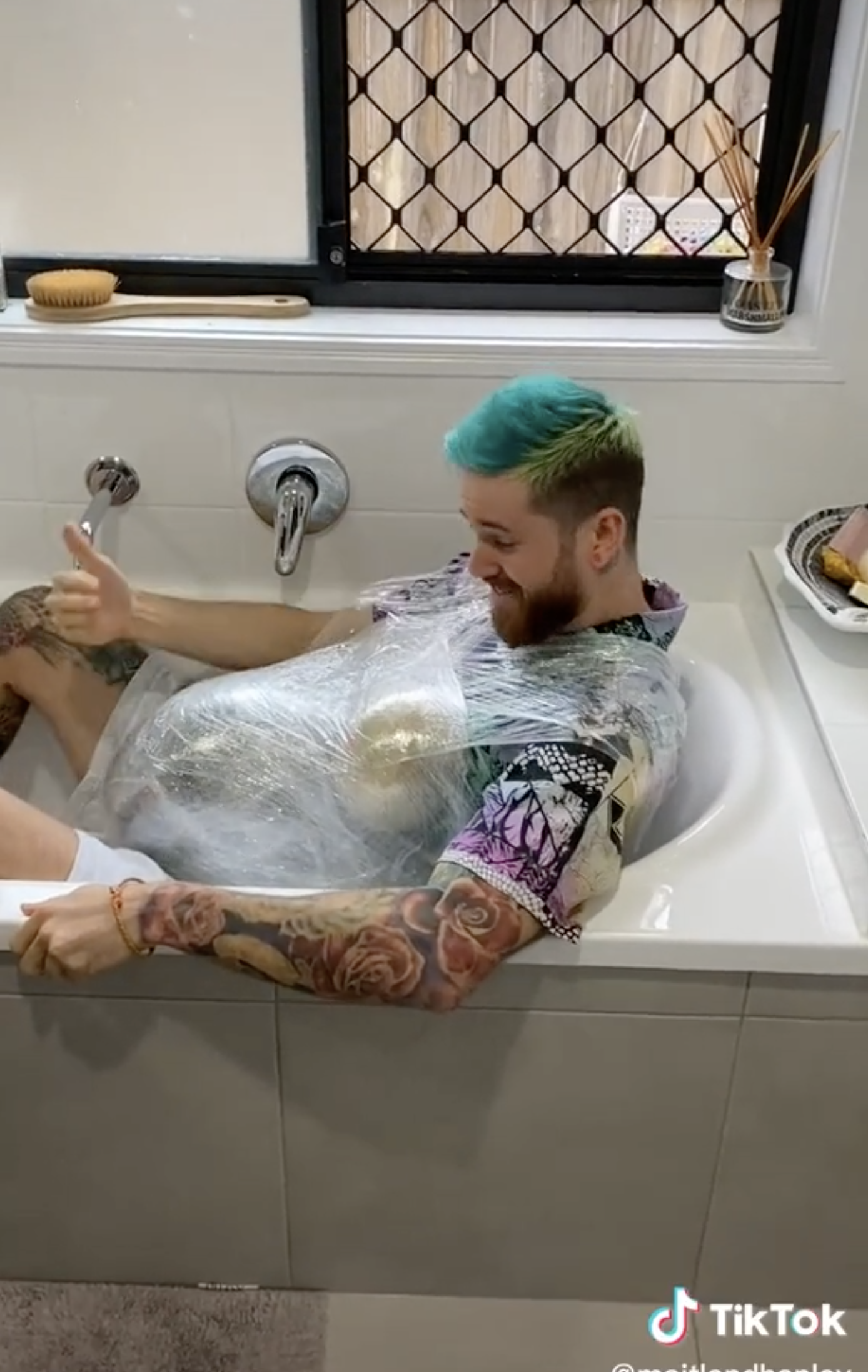 @maitlandhanley Man tries getting out of bath while pregnant 😂 #fyp #watermelonchallenge #pregnantbelly #bathtok #pregnantman