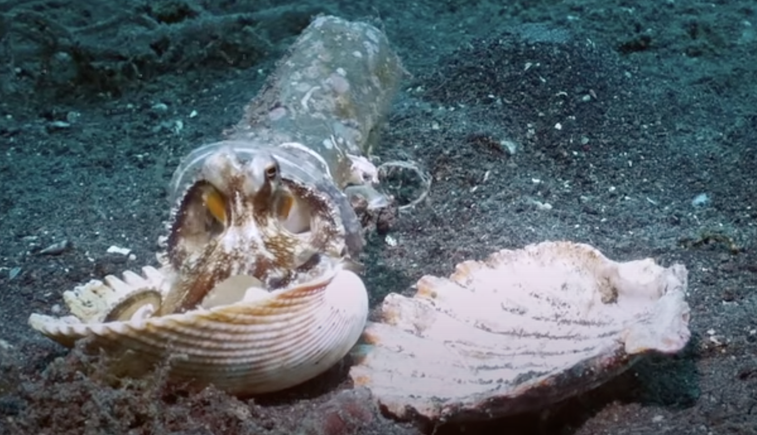 ▼潛水員為章魚寶寶找了好幾個貝殼,希望牠能搬家。章魚寶寶原本不捨得塑膠杯,在潛水員的說服下,才換上貝殼,帶著新家離開: