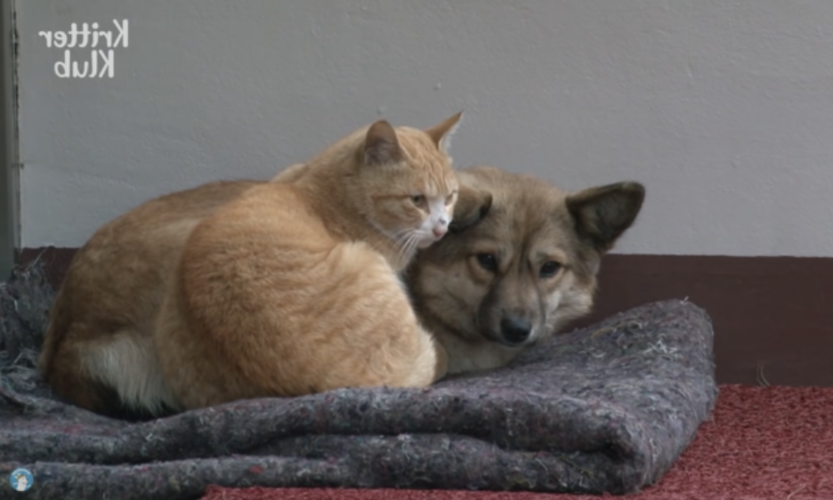 ▼2個月前,一隻流浪橘貓跟小黃狗成為了朋友。牠們每天一起玩、窩在一起睡覺,一起守在公寓前。附近的民眾為牠們搭建了一個小屋,還會定時給牠們餵食,以免牠們挨餓受凍。