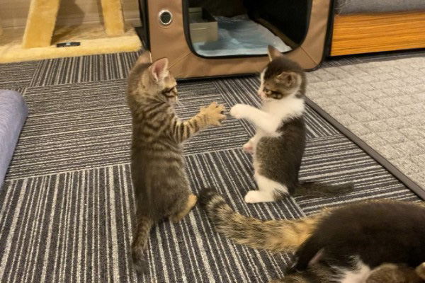 ▼那天一隻小虎斑貓和另一隻白底虎斑小貓一起玩耍。牠們互相追逐,活潑的模樣非常可愛。推主想將2隻小貓玩耍的畫面拍下來,沒想到他拍照時,2隻貓咪正好用後腳站起來,還都伸出一隻手手。小虎斑貓還「開掌花」,就像在跟另一隻貓咪玩「剪刀石頭布」一樣。