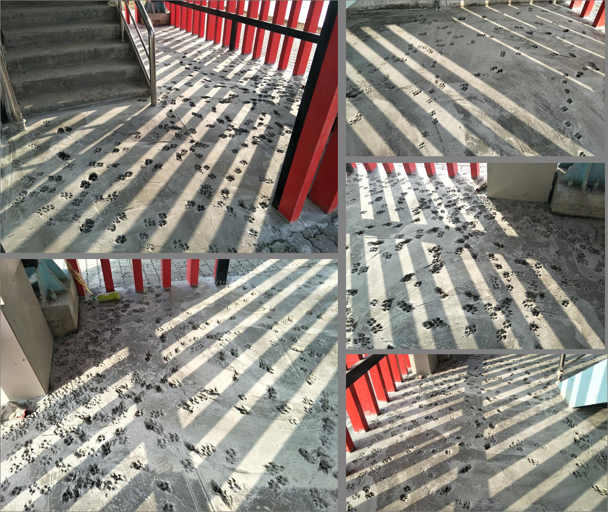 ▼從照片中可以看到,未乾的水泥地上佈滿狗狗的腳印,有些地方腳印非常密集,還有疑似打混的痕跡,可以想像昨晚的情況有多激烈。原po在貼文中說:「昨晚這裡到底是有多熱鬧,有人可以還原真相嗎?早上上班看到臉都綠了。」