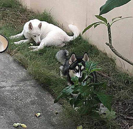 ▼哈士奇躲在植物後瞪著主人,好像在說:「兇什麼?明明就是你沒有帶我們出去散步,該反省的人是你才對。」